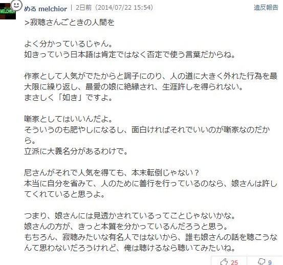 「作家として人気がでたからと調子にのり、人の道に大きく外れた行為を最大限に繰り返し、最愛の娘に絶縁され、生涯許しを得られない。まさしく「如き」ですよ」