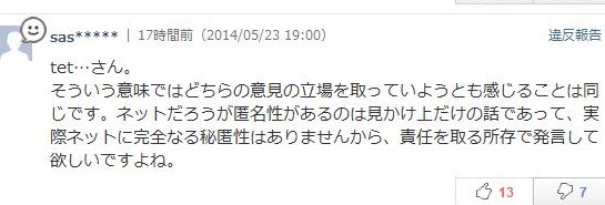 「ネットだろうが匿名性があるのは見かけ上だけの話であって、実際ネットに完全なる秘匿性はありませんから、責任を取る所存で発言して欲しいですよね。」