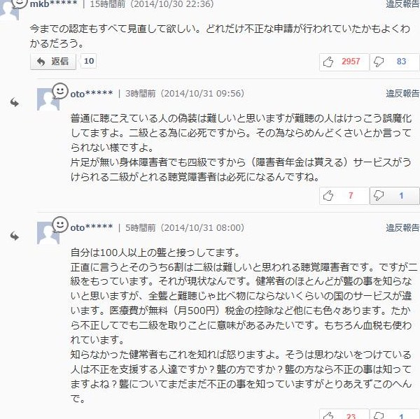 「今二級をもってる聴覚障害者もちゃんと調べないと凄い数が不正してますよ。軽い難聴でも聴こえないふりで二級もらってますからね。電車などのキセル行為、年金の不正受給までやってますから。本当に聴こえない二級をとれる聴覚障害者は今の数の10%ぐらいじゃないのかな…