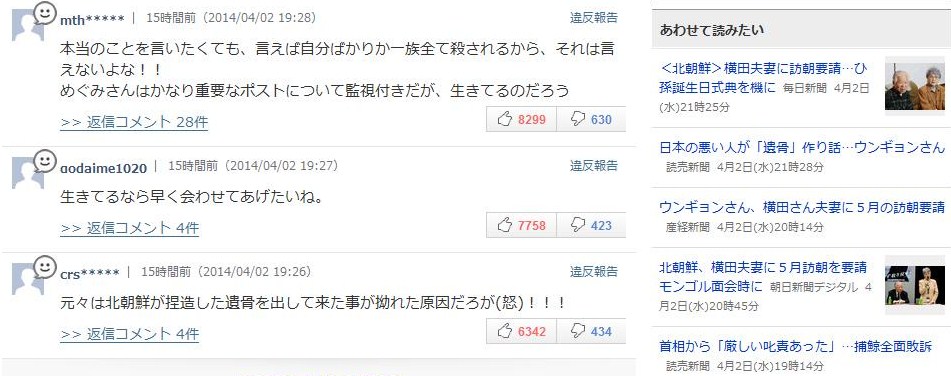 ――「北朝鮮が2004年にめぐみさんのものとして提出しながら別人と判明した遺骨の鑑定結果について、ウンギョンさんが「日本側の悪い人が(話を)作り上げている」と話した」――