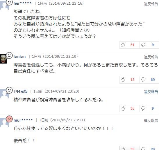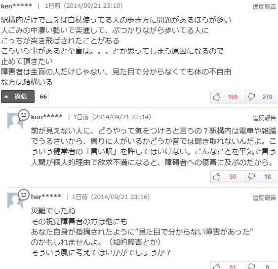 障碍者のなかでも話題が集中している視覚障碍者に関しては、こちらの、塩谷靖子さんと おっしゃるかたのコラムが参考になる。