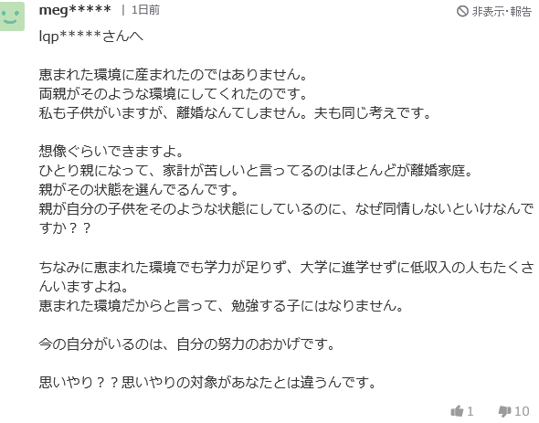 不運で、恵まれない、辛い生活を余儀なくされている人々を軽侮し、罵倒するコメントを、わざわざ投稿しまくって、イイ気に浸る、この、あさましい根性。(呆)