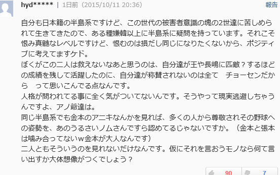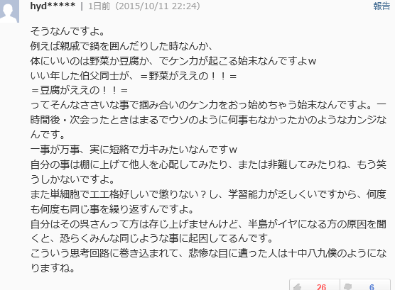 くだんの「ヤフコメ」常連は、いわく「半島系日本人」を名乗っているけれども、そもそも両親とも、あちらの出身なんだろうか、あるいは、もともとの国籍が朝鮮なり韓国だった場合、つまり、かなり後になってから、日本国籍を取得したという場合は、どういうものか、「同族憎悪」の甚だしさに加え、「育ての国」たる日本に対しては、殊更の肩入れを するという顕著な傾向も出てくるらしい。