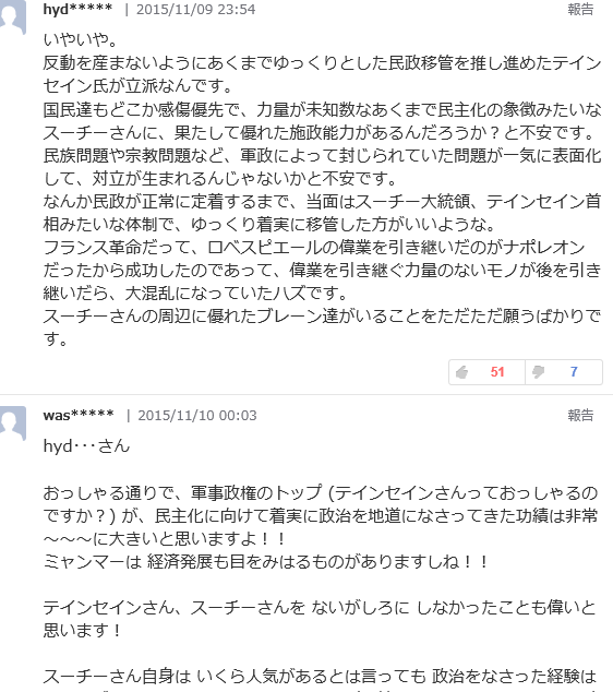 軍事独裁政権が早手回しにて、あらかじめ、スーチーさんが大統領には就けない法を拵えてしまっていたことも知らずか、このコメントに賛同している他のネトウヨ投稿者が また、