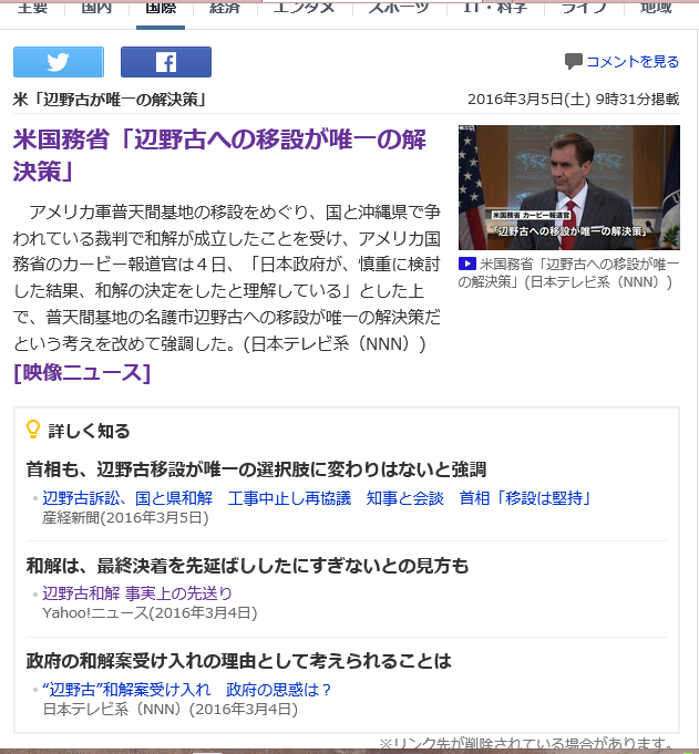 最終的には日本政府が「辺野古しかない」という選択をしているんですよ。アーミテージ氏は「ダメなら代替案を出せ」と言っているし~