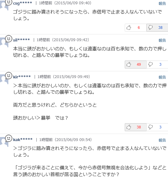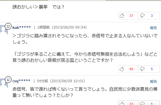 ~「ゴジラが来ることに備えて、今から赤信号無視を合法化しよう」などと言う頭のおかしい首相が居る国ということですか?~