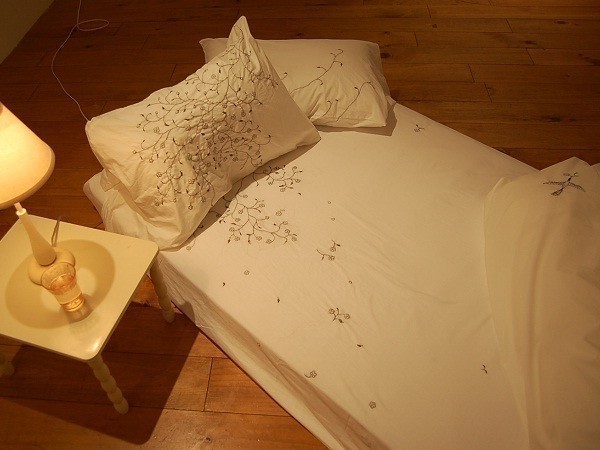 真っ白の枕とシーツ、ベッドカバーに高橋さん自身の髪の毛で刺しゅうを施した作品。